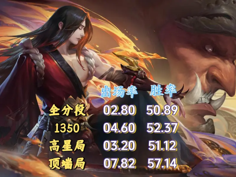 在最新的数据中,我看到了橘右京不一样的一面,在顶端局,也就是巅峰千强中,橘右京甚至打出了57%这种离谱的胜率,而出场率接近8%绝对不算冷门。